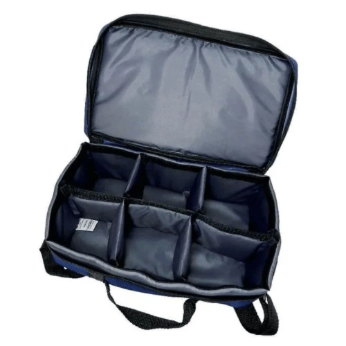Bolsa EBF Porta Carretilha ou Molinete com 6 Espaços para acomodar as carretilhas ou molinetes de forma organizada, sem misturar com outros itens da tralha de pesca.
