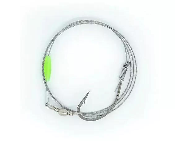 Componentes: 1 Girador N1, 95cm de cabo de aço 90LB, Miçanga, 1 anzol Maruseigo n30 e presilha de alumínio.