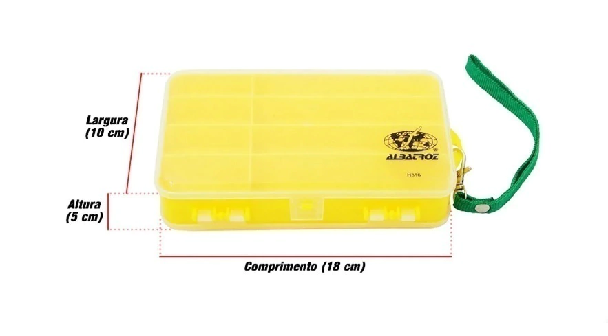 Estojo organizador Dupla Face da Albatroz H316 veio para facilitar sua vida, com 13 compartimentos para melhor guardar as tralhas de sua pescaria. Ideal para organizar e transportar vários objetos como: Anzóis, Giradores, agulha, Anel, Bijuterias, Grampos, Botões e e objetos que estiverem dentro da capacidade da caixa. Feito de plástico resistente para longa duração, e também possui um cordão para auxiliar no transporte.