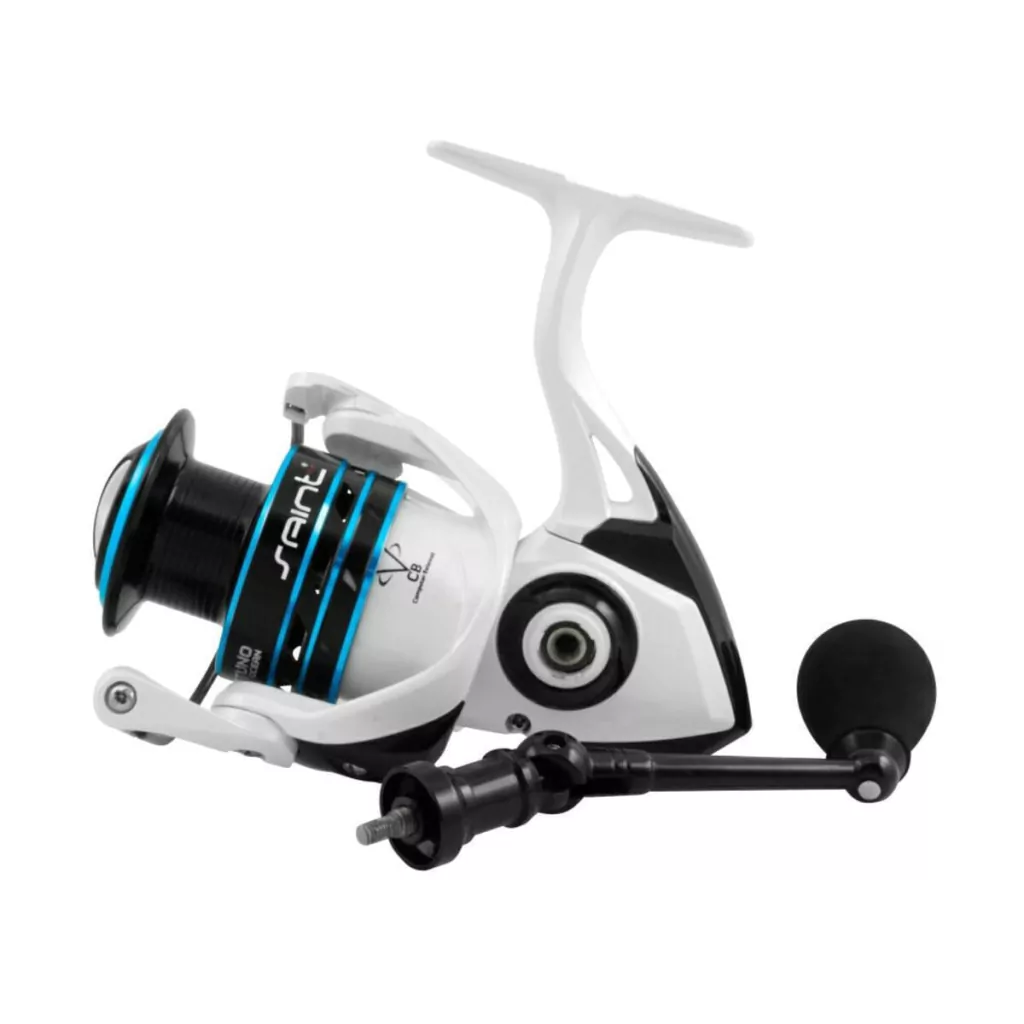 O molinete Saint Plus Netuno possui pintura perolizada, balanceamento computadorizado e pegadores da manivela em EVA, tornando sua pescaria mais agradável.